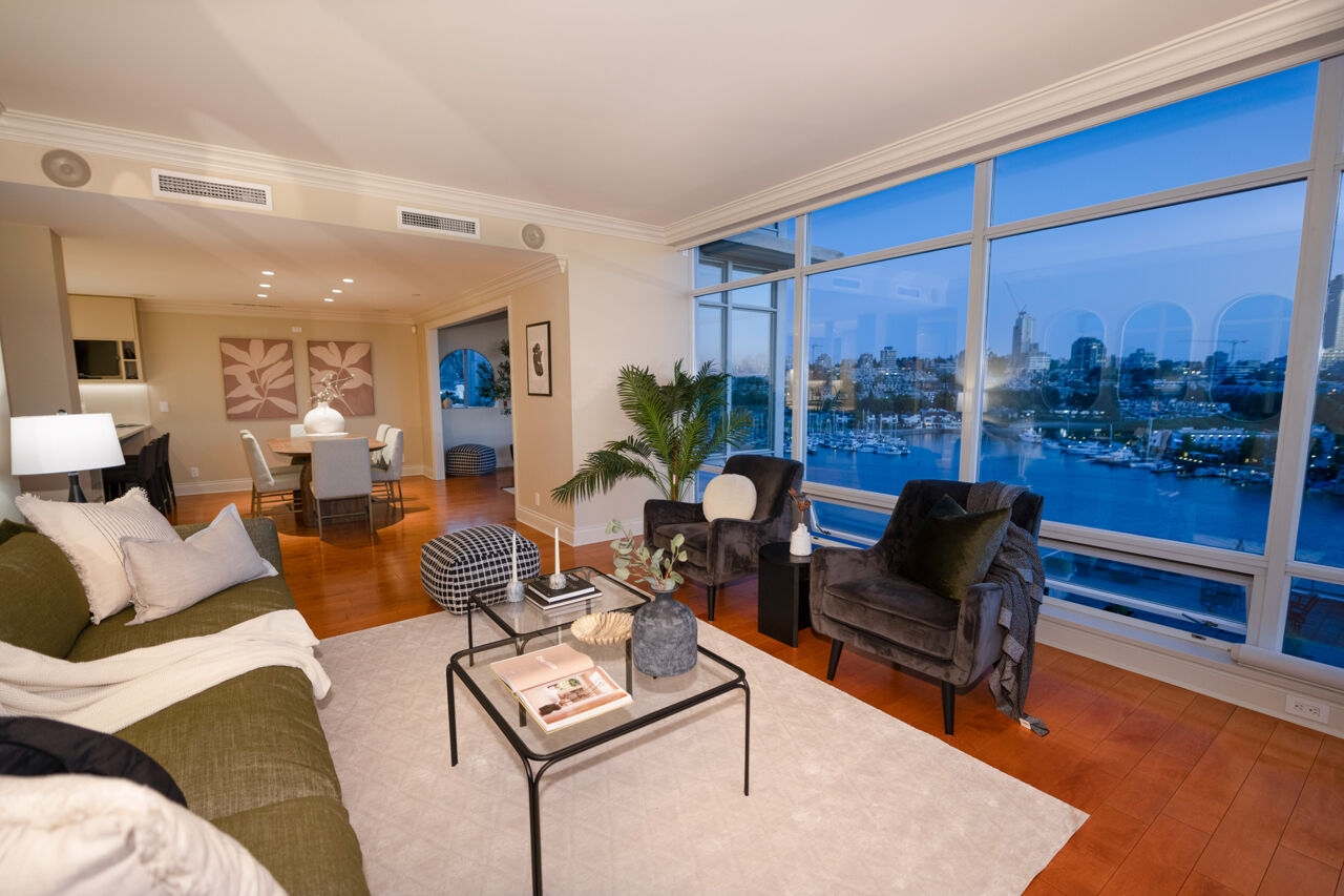 A rare opportunity to own a coveted SW corner waterfront residence at world class King's Landing, overlooking False Creek and George Wainborn Park. This 1729 sq. ft., 2-bed + sitting room, 2 1/2 bath home offers sweeping, unobstructed water and park views from every principal room and a spacious covered deck that feels like you are floating above the Seawall and the park - the perfect perch to watch boats glide by and sunsets paint the sky. Featuring a tastefully renovated modern kitchen with Miele appliances, a luxurious primary bedroom suite with custom walk-in closet, Air Conditioning, remote blinds, and and extra-large private gated 2-car garage with work-bench, storage cabinets, and EV charger. Resort-style amenities, 24-hr concierge, indoor pool, sauna/steam, gym, theatre, and more. Steps to Yaletown dining, and the city’s finest waterfront lifestyle.