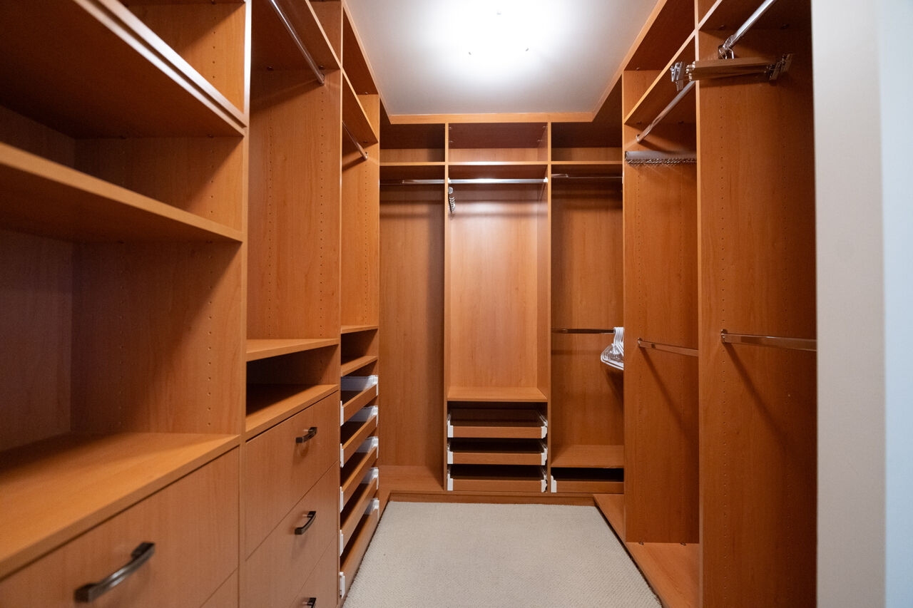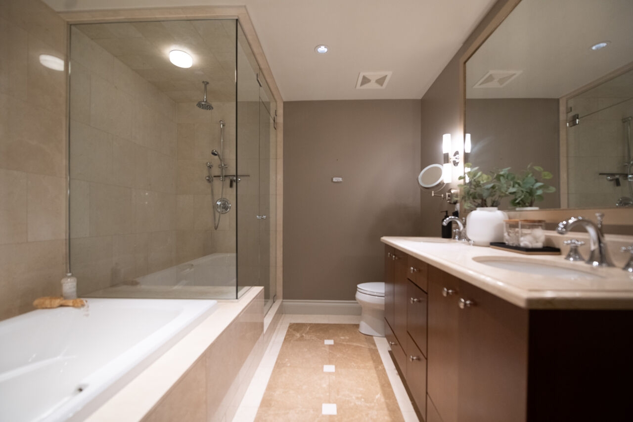 Luxurious west-facing king-size primary bedroom, with extra-large custom walk-in closet and spa inspired bathroom with double vanity, soaker tub and glassed in shower
