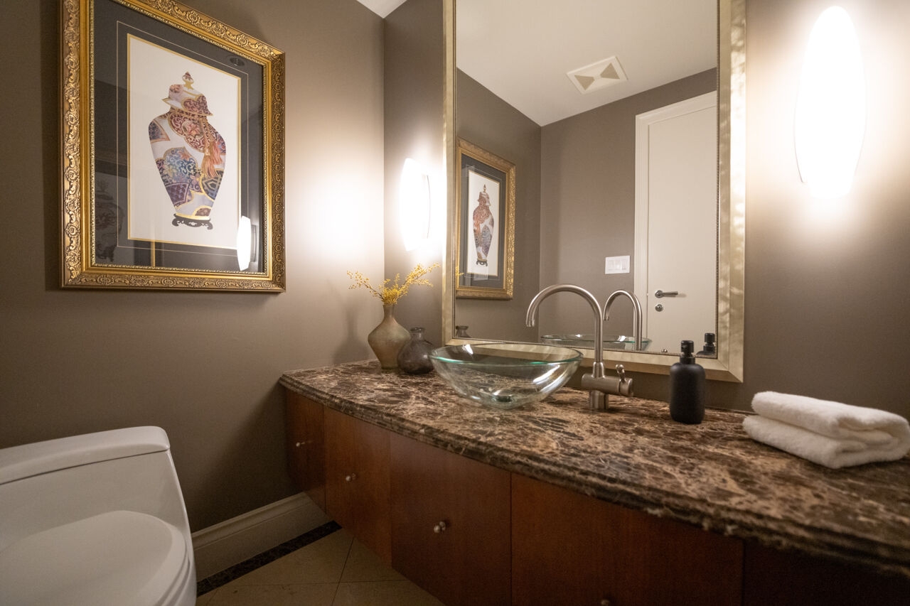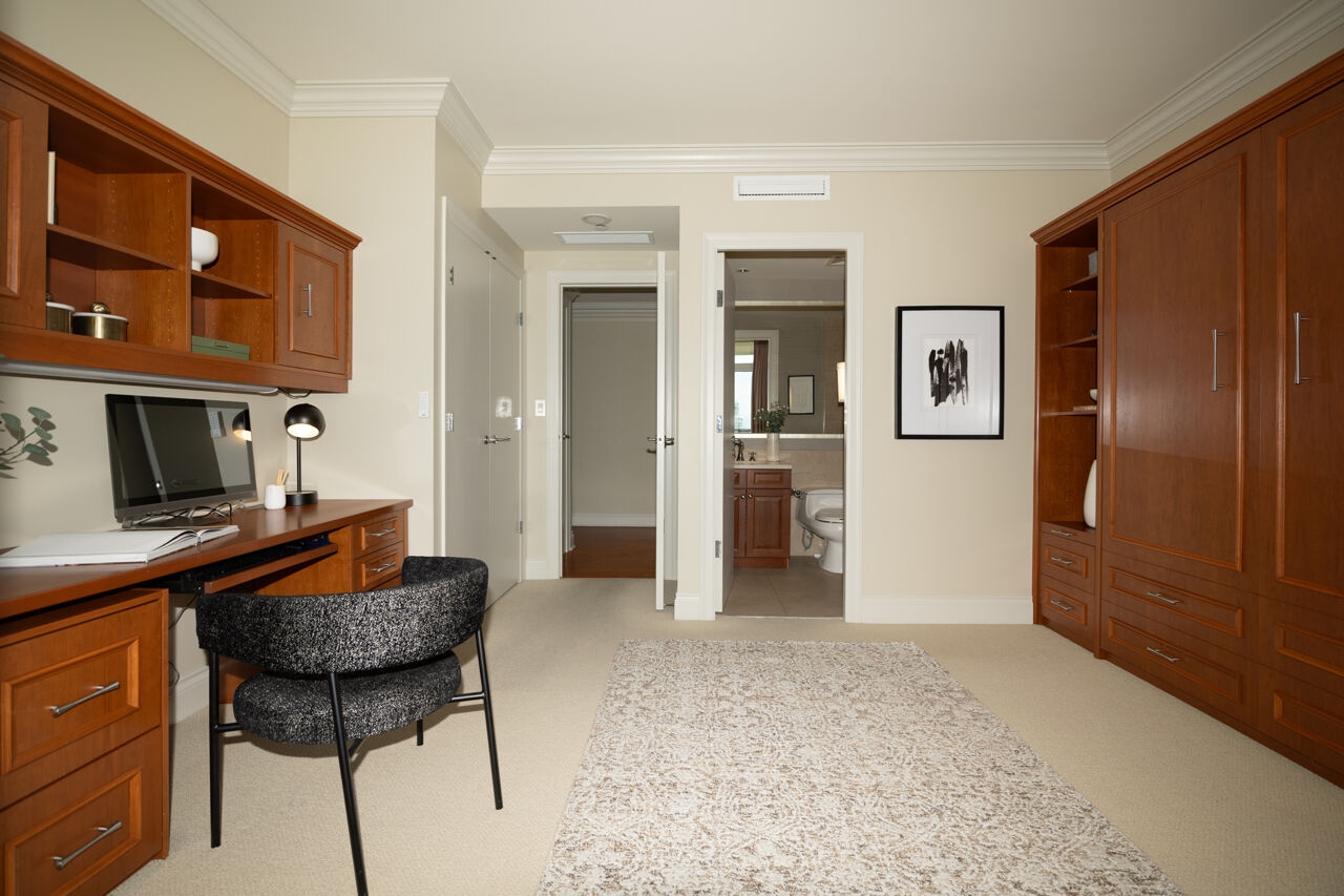 Second bedroom with custom Murphy bed, built-in desk and shelving (2020), and renovated ensuite bathroom (2020)
