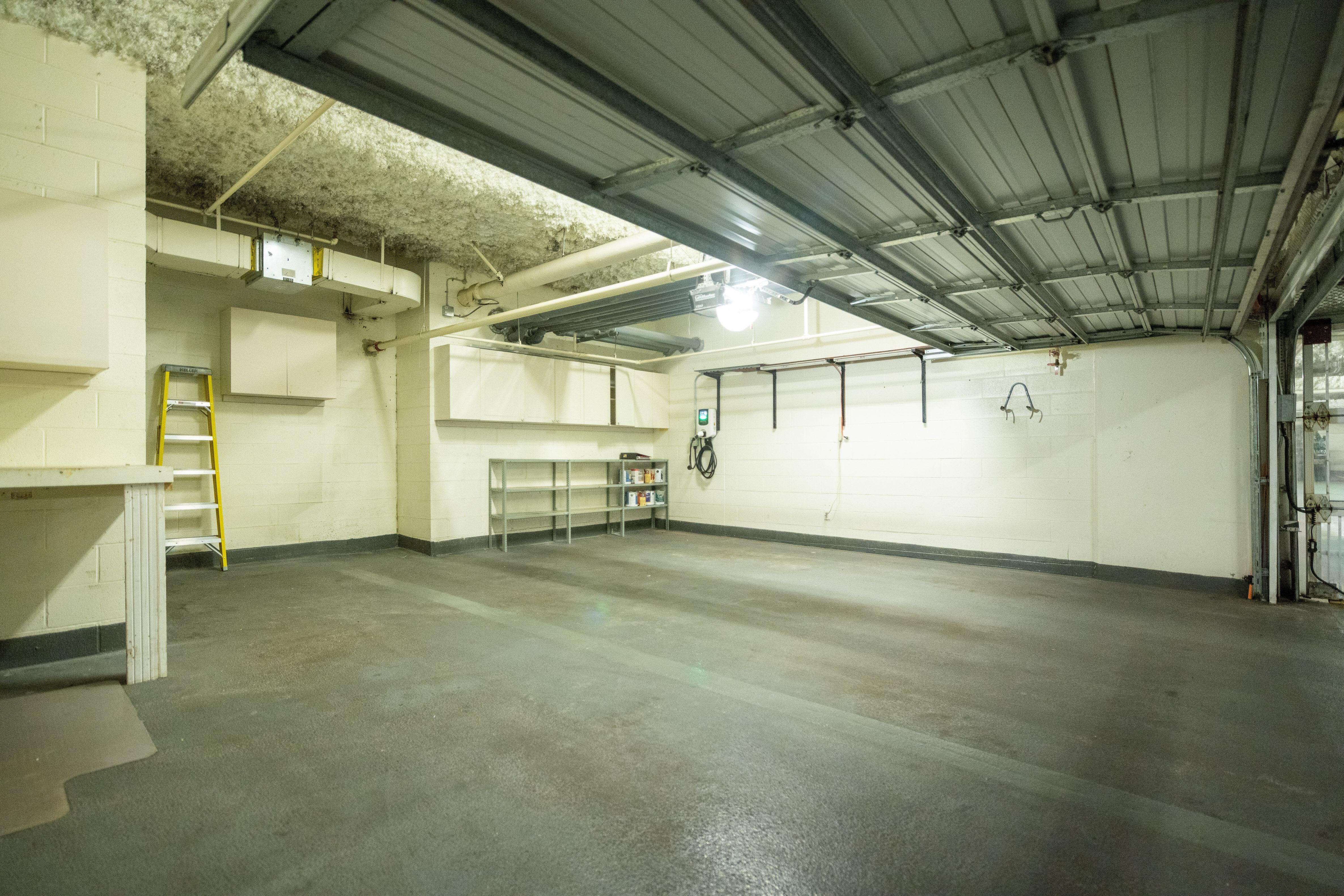 Over-sized 2-car gated private garage, with EVcharger, work bench, storage cabinets, and lockable storage room