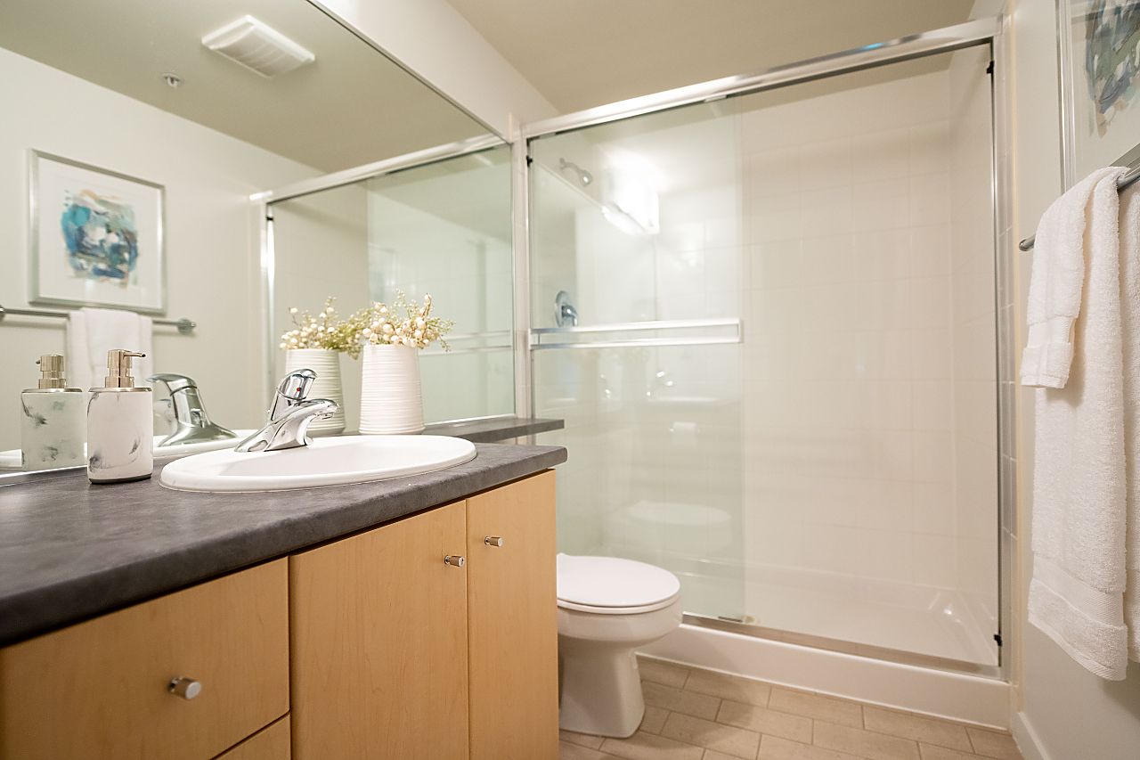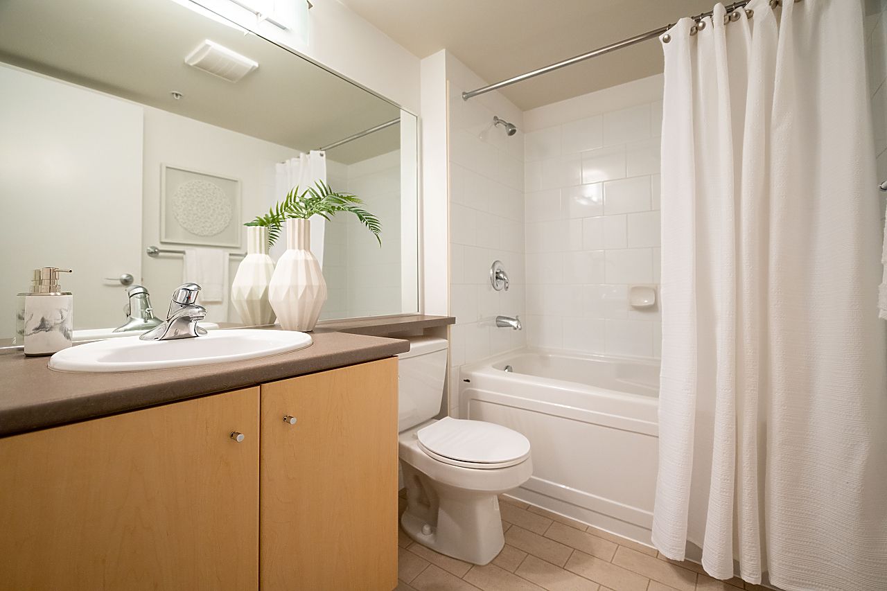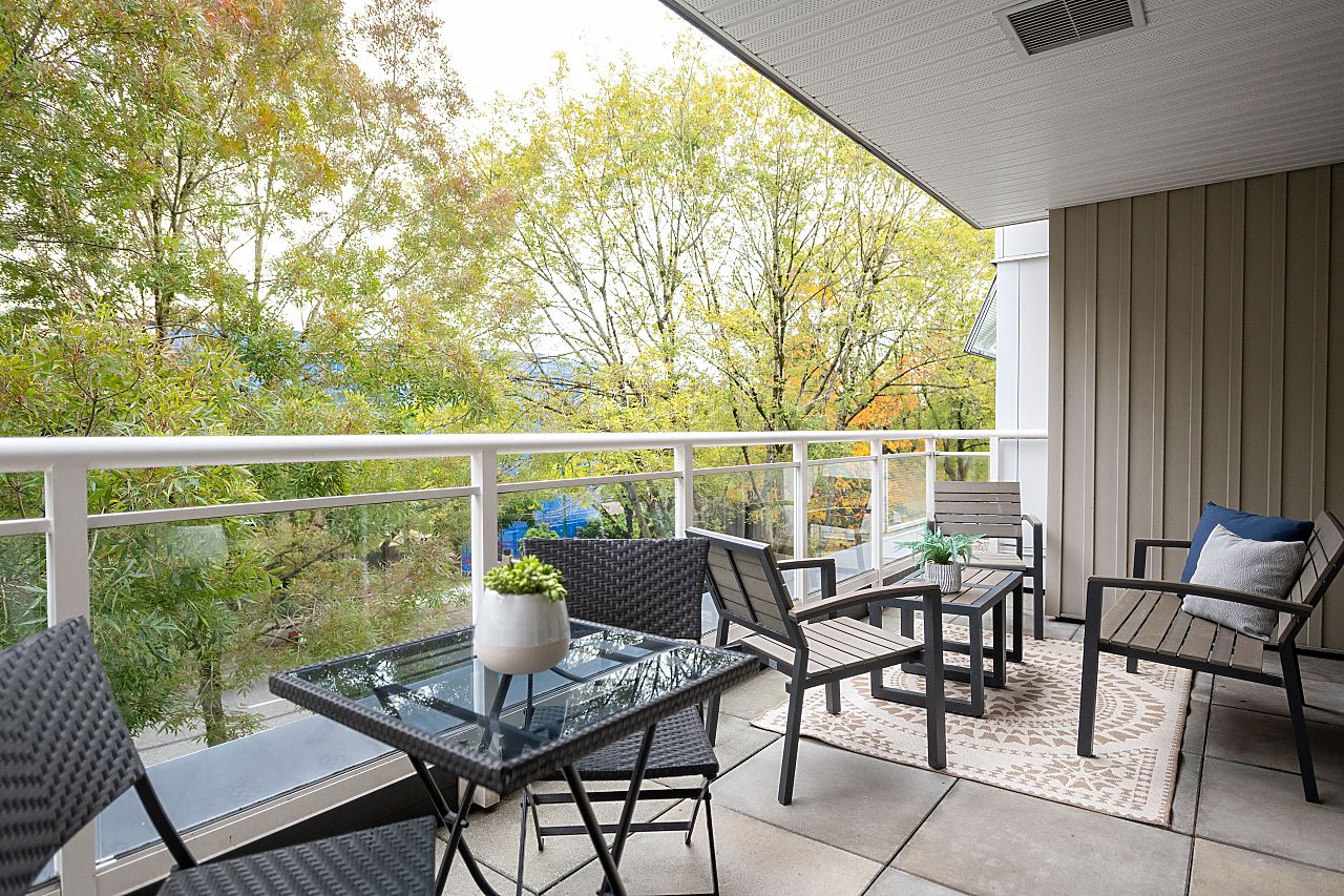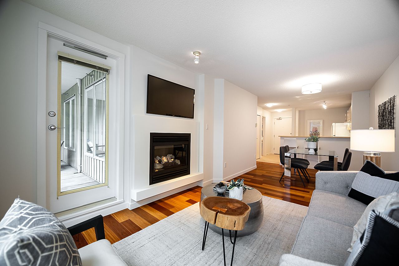 This nicely layed-out 895 sq. ft. condo, with green tree-top outlook, offers an open-plan living and dining area that opens to a large 124 sq. ft south-facing deck with space to lounge and dine outdoors, perfect for BBQs and entertaining. Features include hardwood floors, cozy gas fireplace, family-size kitchen with eating bar, and a king-size master bedroom with ensuite bathroom. This home is immaculate, has been freshly painted, and is move-in ready! One parking and a storage locker are included.