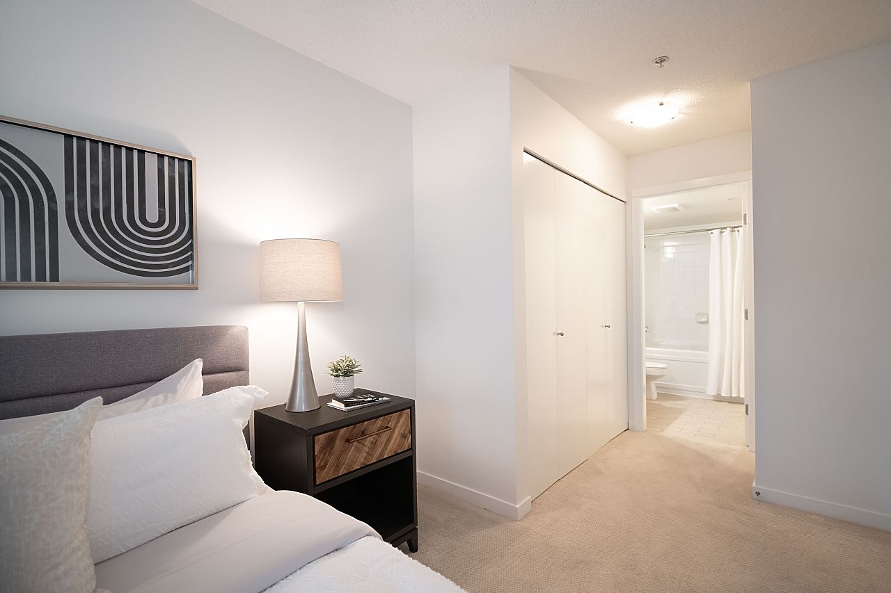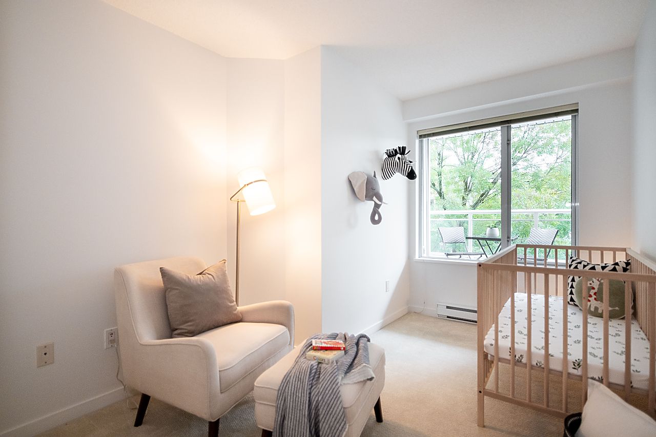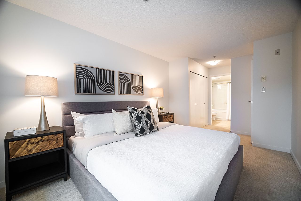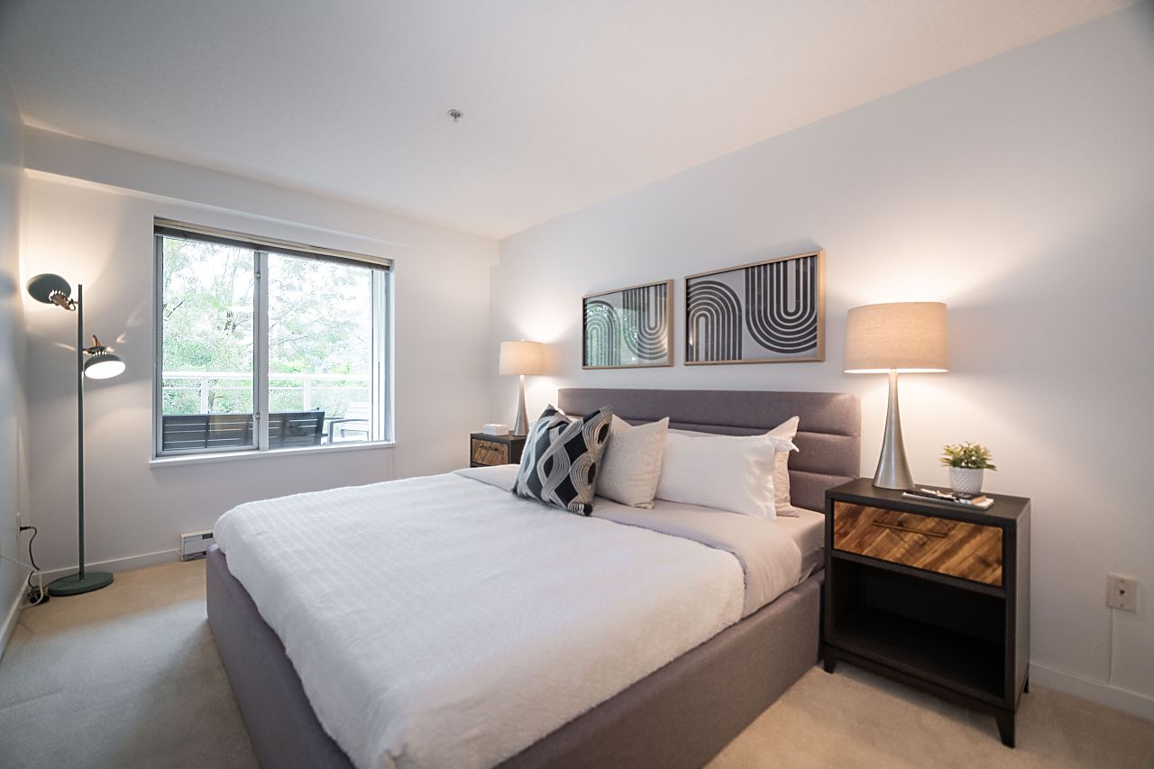 This nicely layed-out 895 sq. ft. condo, with green tree-top outlook, offers an open-plan living and dining area that opens to a large 124 sq. ft south-facing deck with space to lounge and dine outdoors, perfect for BBQs and entertaining. Features include hardwood floors, cozy gas fireplace, family-size kitchen with eating bar, and a king-size master bedroom with ensuite bathroom. This home is immaculate, has been freshly painted, and is move-in ready! One parking and a storage locker are included.