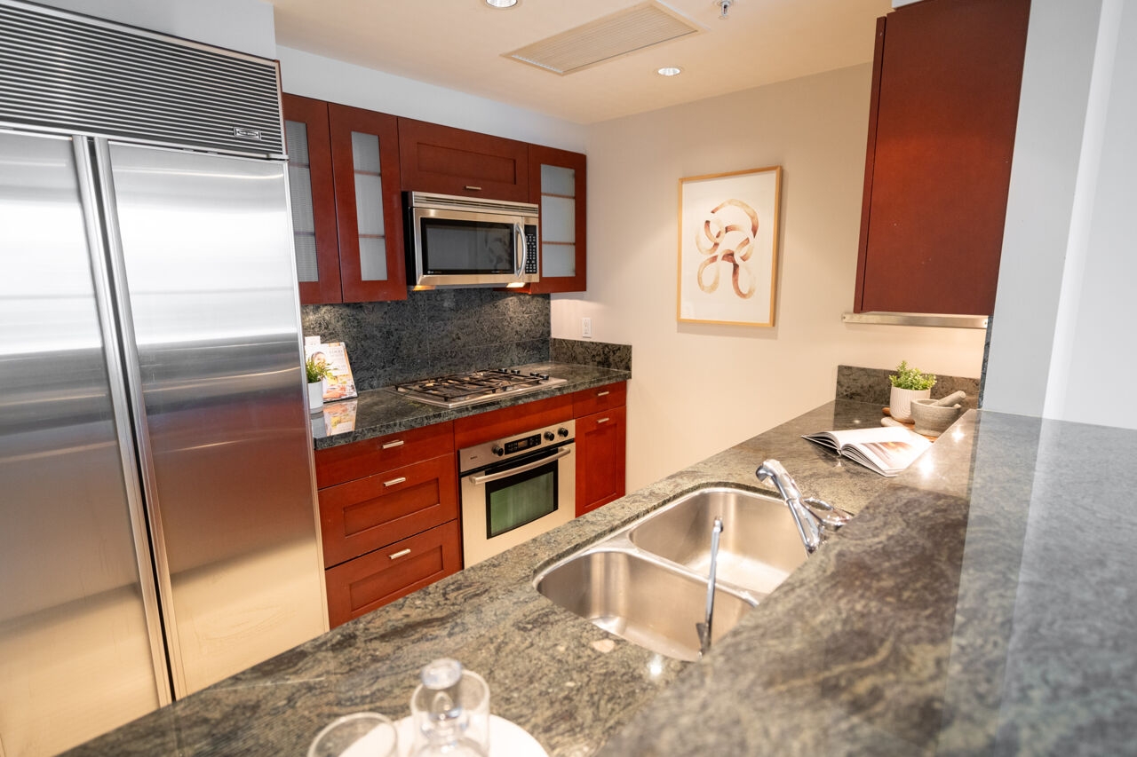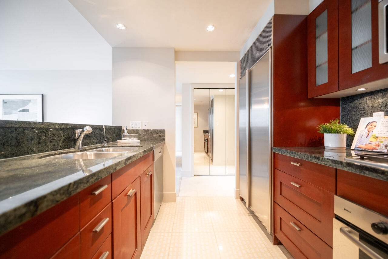 Generous kitchen with lots of storage, stone counters, 4-burner gas cooktop, Bosch wall oven, Sub-zero fridge, Bosch dishwasher