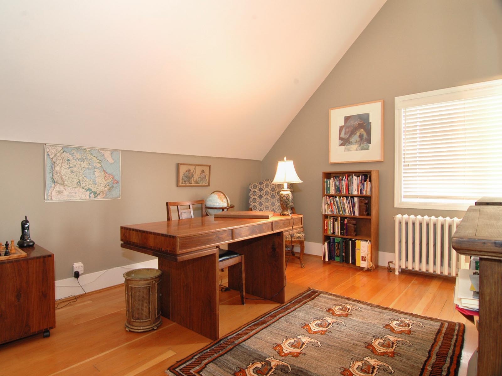 The main floor features living room with gas fireplace and French doors opening to the front veranda, a spacious dining room with stained glass windows, and a bedroom/office with an ensuite bathroom. The sun-filled main-floor kitchen with granite counters, Fisher & Paykel and Bosch appliances opens to large south facing deck and landscaped garden.
