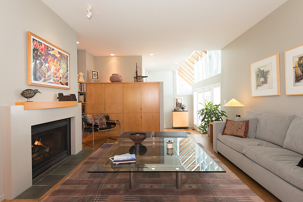 - Living room with custom built-in shelving/storage and gas fireplace