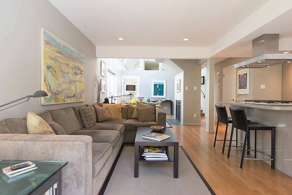 - Open-plan den with built-in shelving