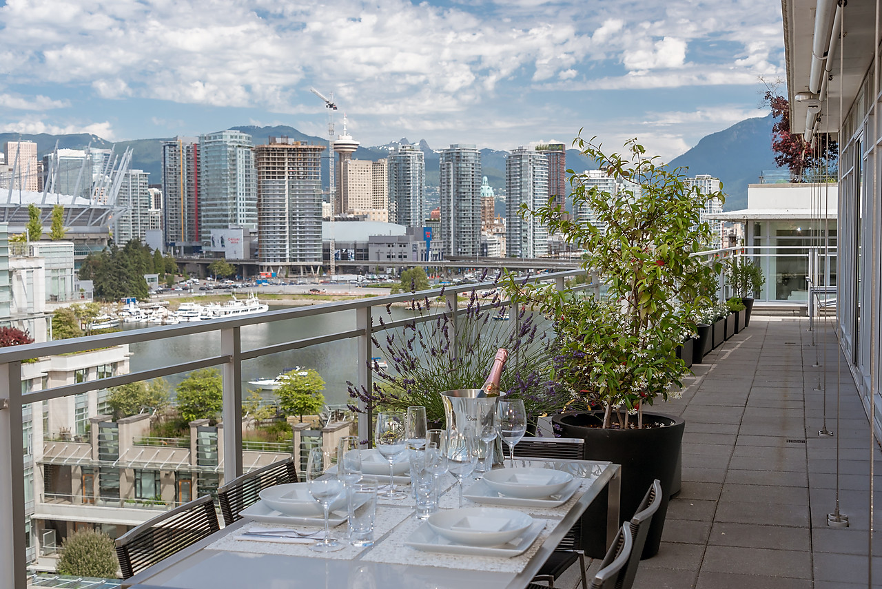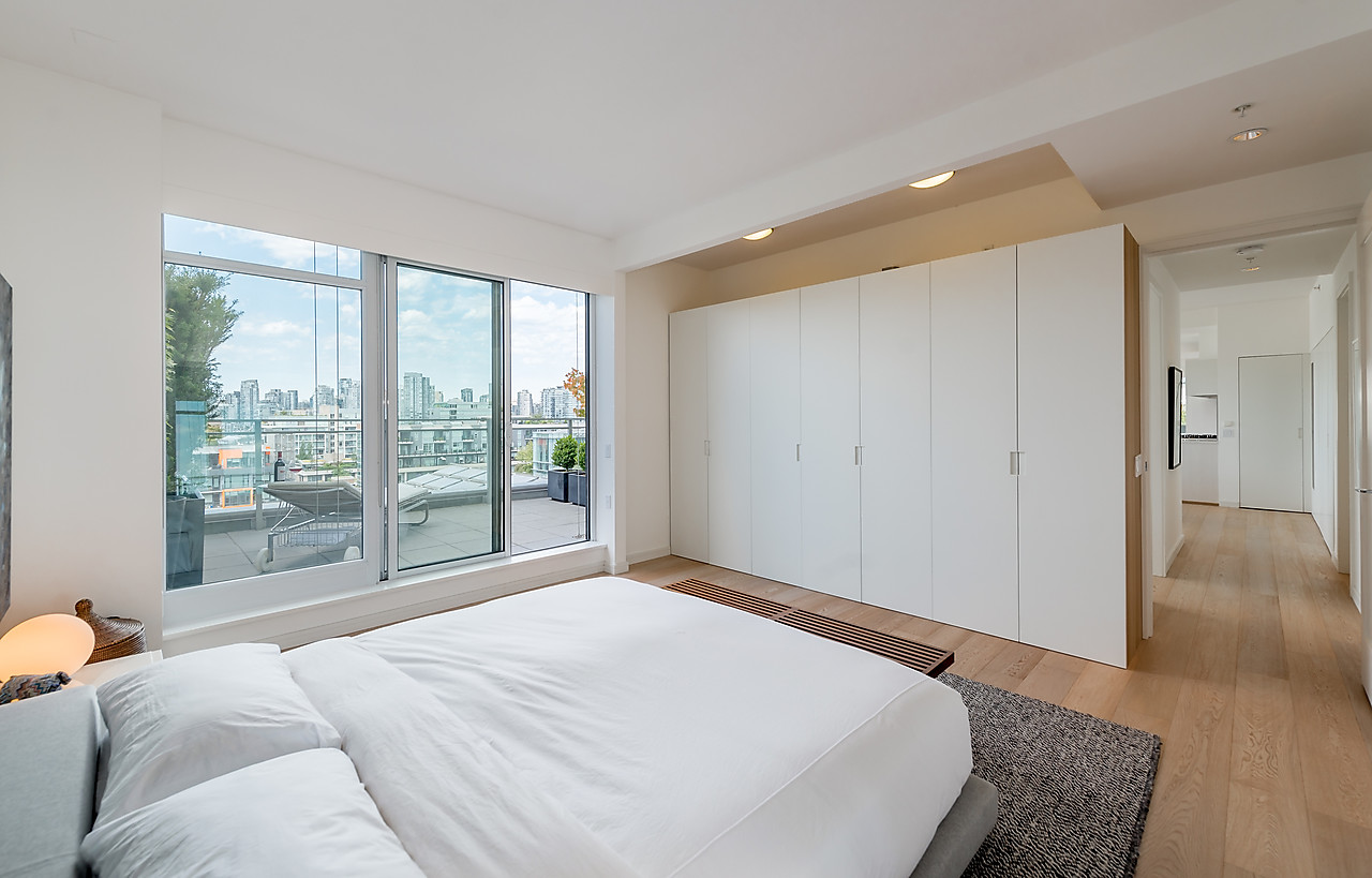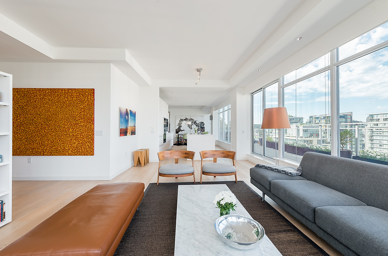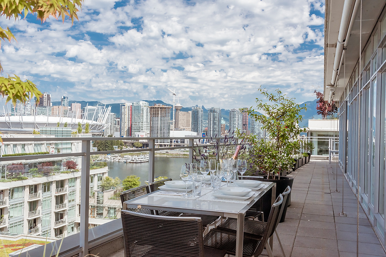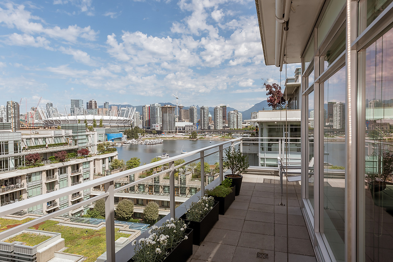 VIEWS TO FALSE CREEK and glorious western exposure from this ULTRA-CHIC, 2 bedroom plus office, CUSTOM DESIGNED condo that opens to a fabulous 841 SQ FT WRAP-AROUND DECK enjoyed from every room. This stylish and sophisticated home features new wide-plank White Oak floors throughout, sleek custom cabinetry, remote access lighting system, 108-bottle Gaggenau wine fridge, fine Eggersmann cabinetry, Sonos Sound System, six Miele appliances, 36" SubZero fridge, side-by-side laundry, Travertine-clad bathrooms and a state-of-the-art heating and cooling system. Well-equipped gym plus access to the Gold Medal Club with indoor swimming pool. TWO SIDE-BY-SIDE PARKING AND TWO STORAGE LOCKERS. Truly exquisite!!