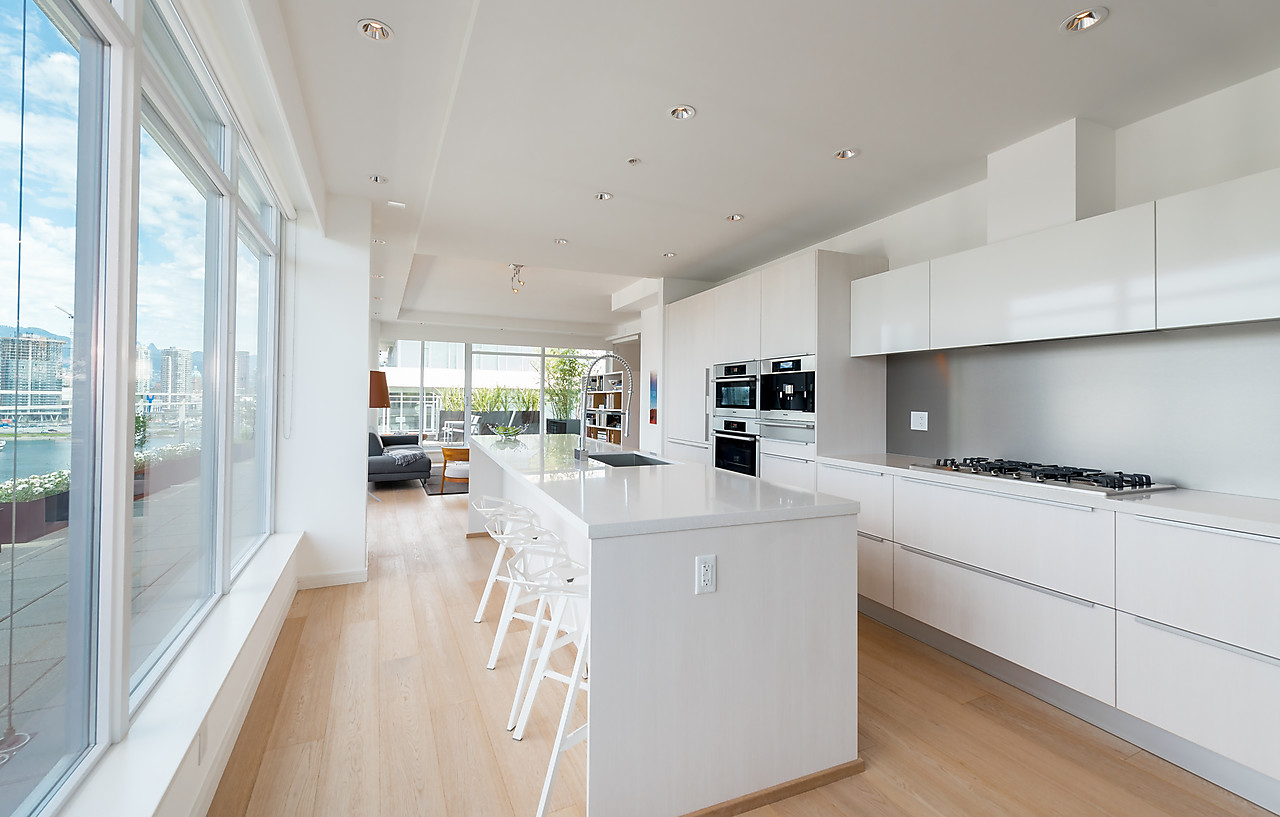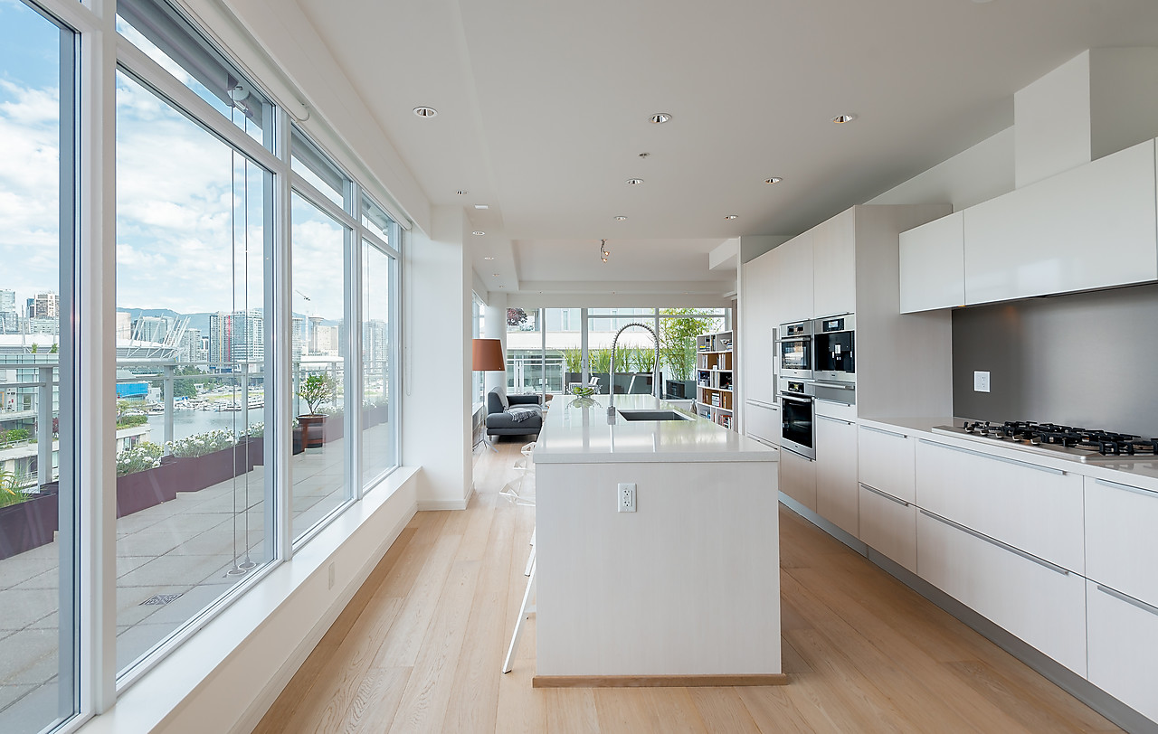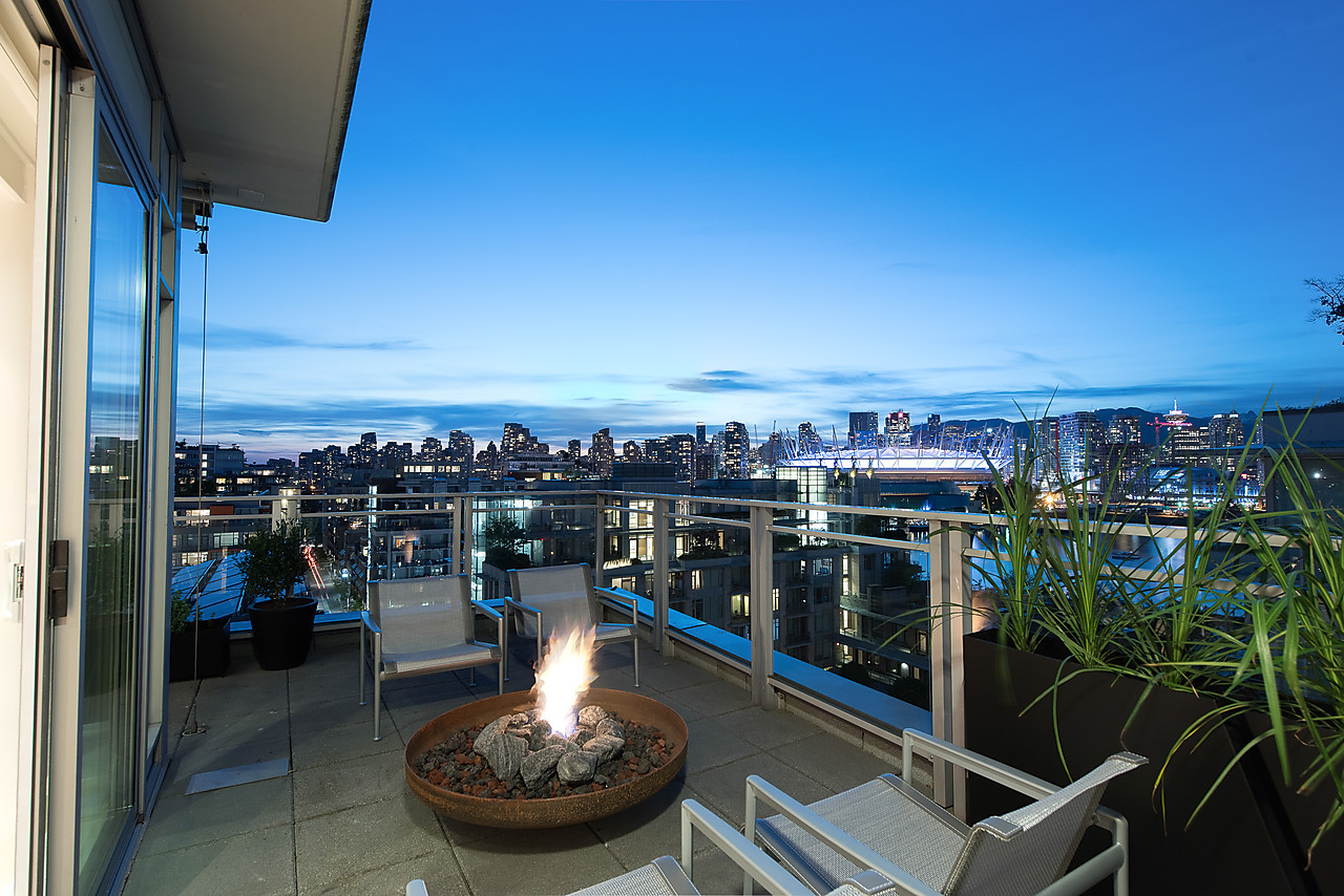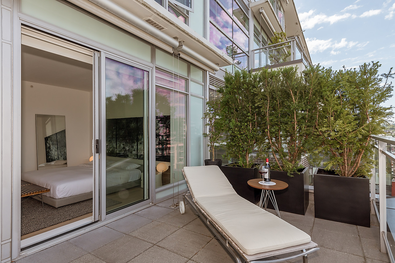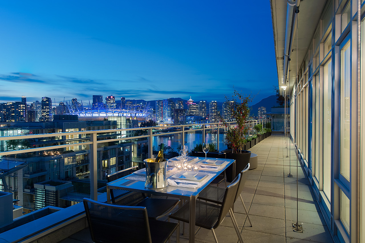 VIEWS TO FALSE CREEK and glorious western exposure from this ULTRA-CHIC, 2 bedroom plus office, CUSTOM DESIGNED condo that opens to a fabulous 841 SQ FT WRAP-AROUND DECK enjoyed from every room. This stylish and sophisticated home features new wide-plank White Oak floors throughout, sleek custom cabinetry, remote access lighting system, 108-bottle Gaggenau wine fridge, fine Eggersmann cabinetry, Sonos Sound System, six Miele appliances, 36" SubZero fridge, side-by-side laundry, Travertine-clad bathrooms and a state-of-the-art heating and cooling system. Well-equipped gym plus access to the Gold Medal Club with indoor swimming pool. TWO SIDE-BY-SIDE PARKING AND TWO STORAGE LOCKERS. Truly exquisite!!