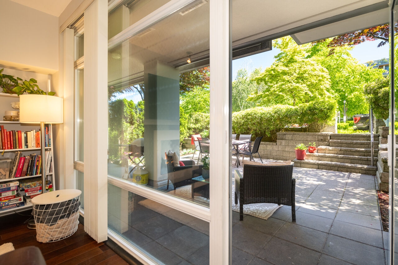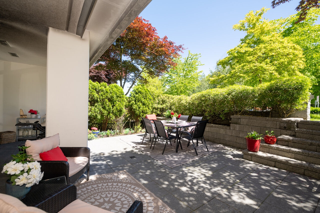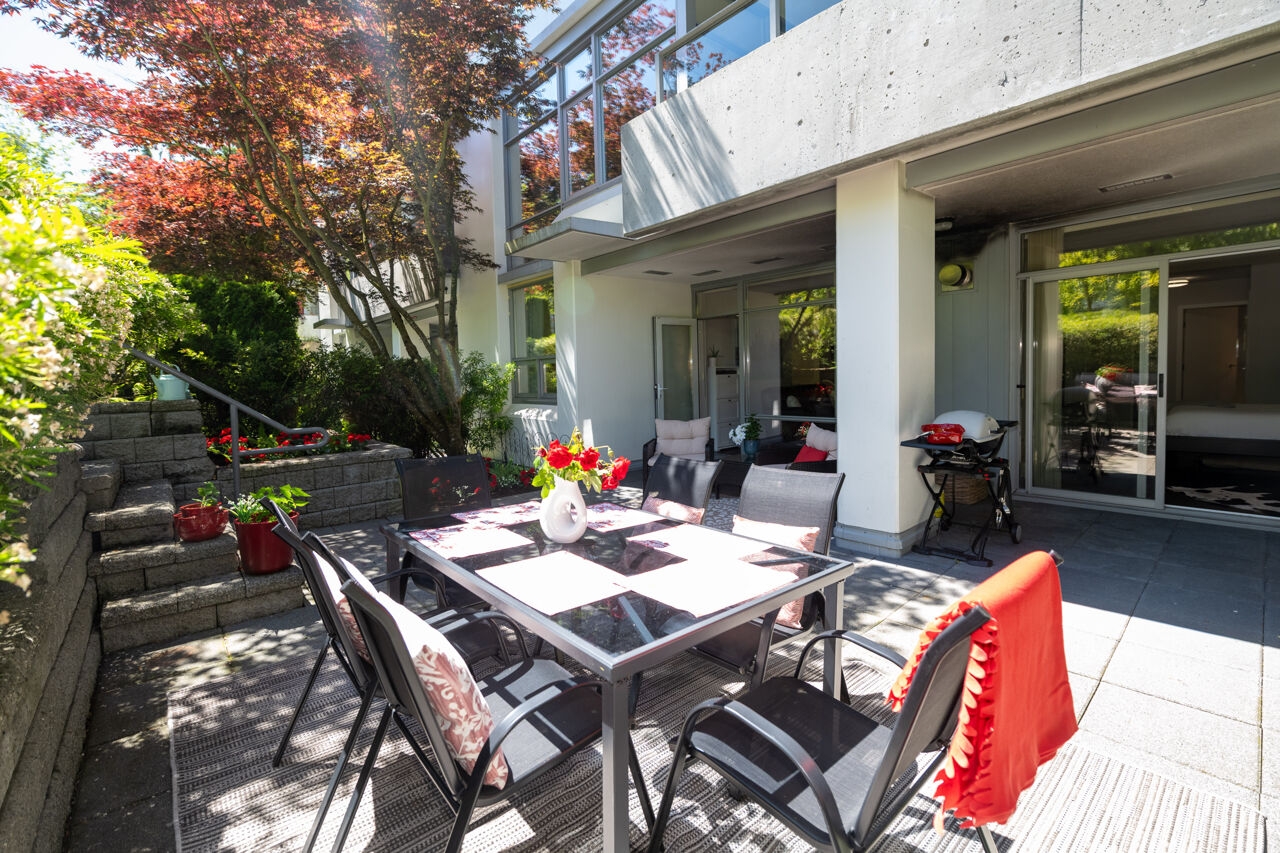A unique contemporary 2-level townhouse-like condo at UBC, with a massive patio and direct street access. Offering 1653 sq. ft. of interior space with 2 large bedrooms and a den with Murphy bed on the main level, and a huge rec room on the lower level that is currently used as a 3rd bedroom. Soaring over-height ceilings on both levels. Direct access to 2 parking stalls in secure underground lot. Perfectly set on a quiet tree-lined boulevard.