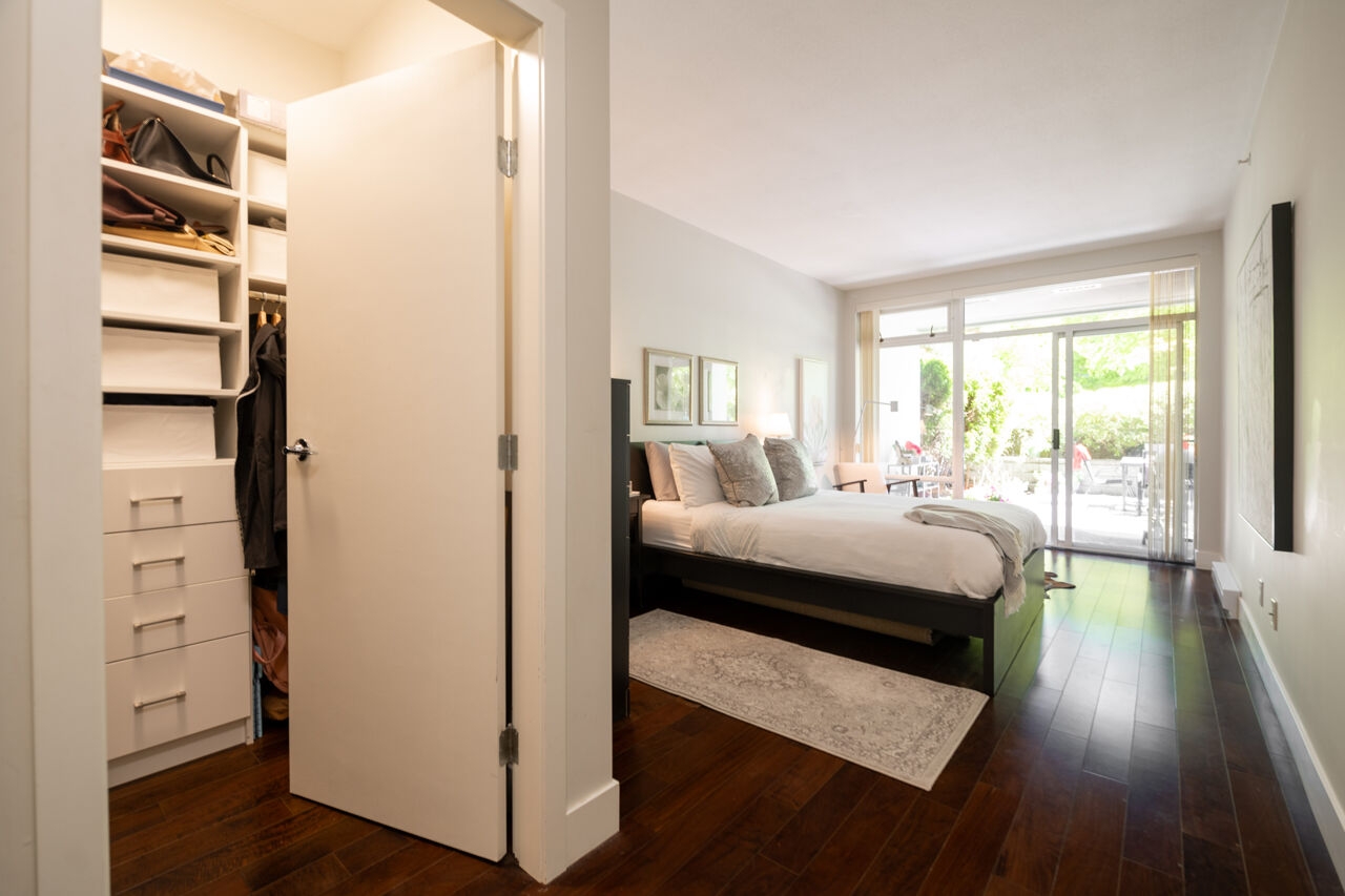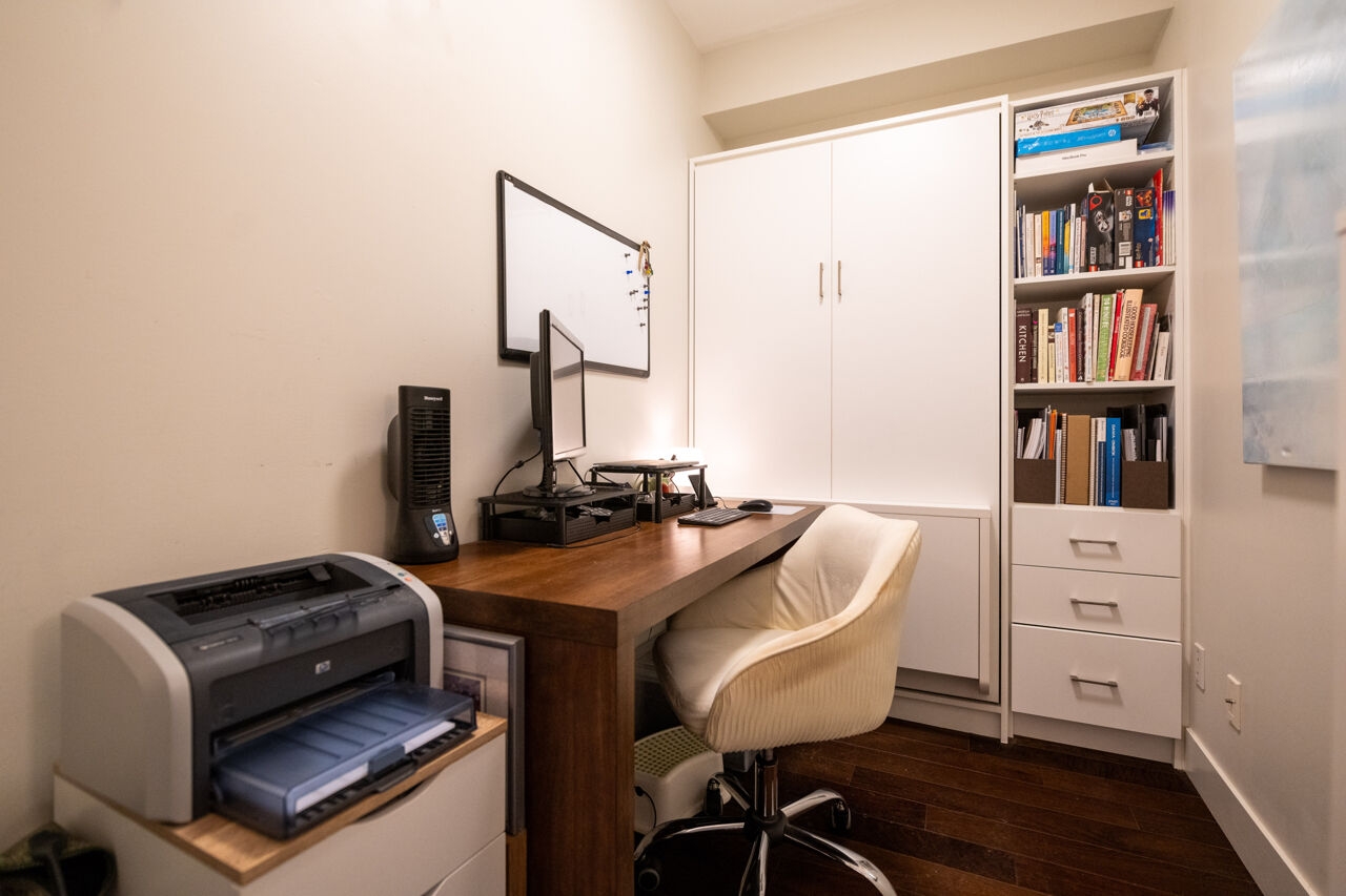 Den/office conveniently tucked behind sleek sliding barn-door with built-in Murphy bed
