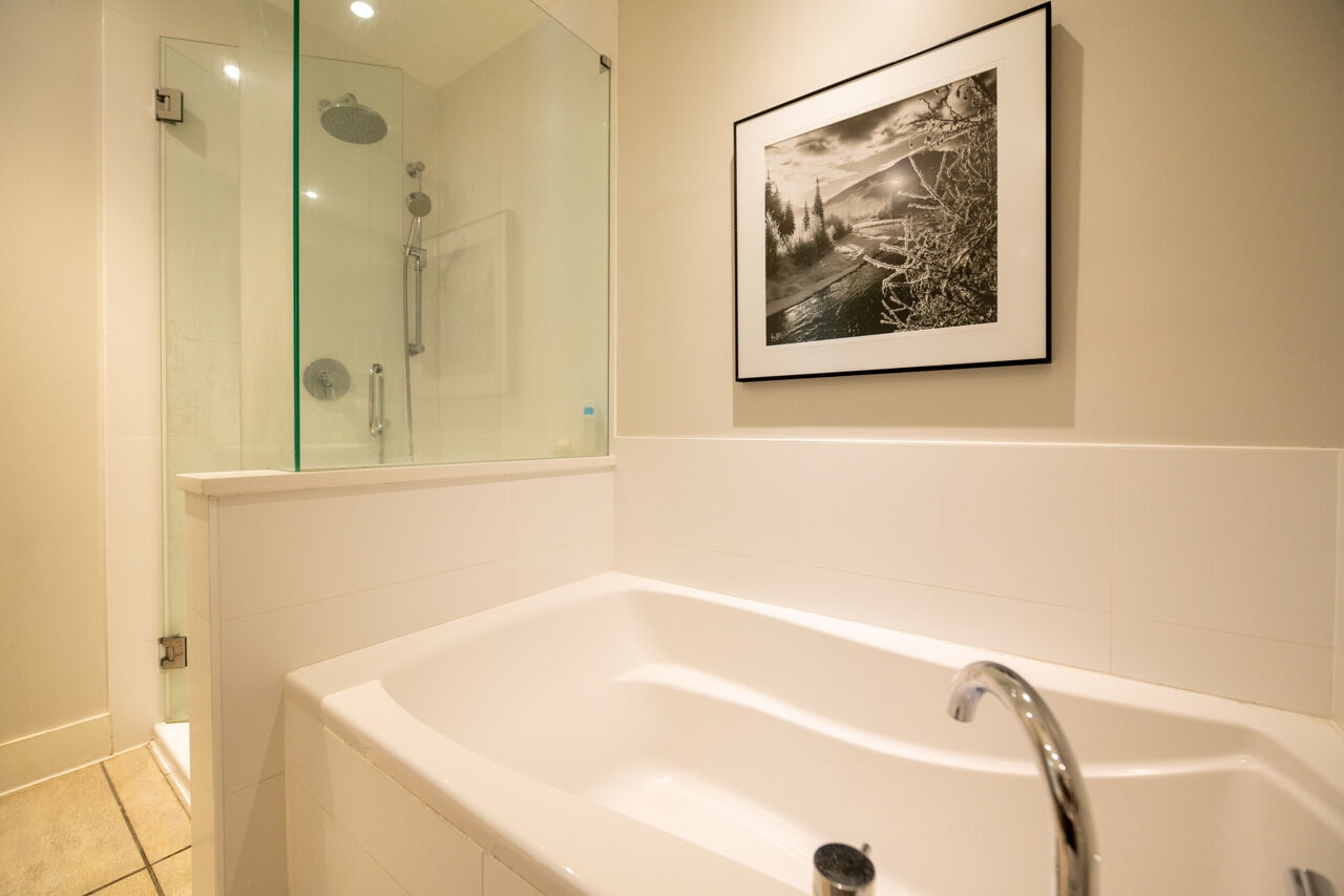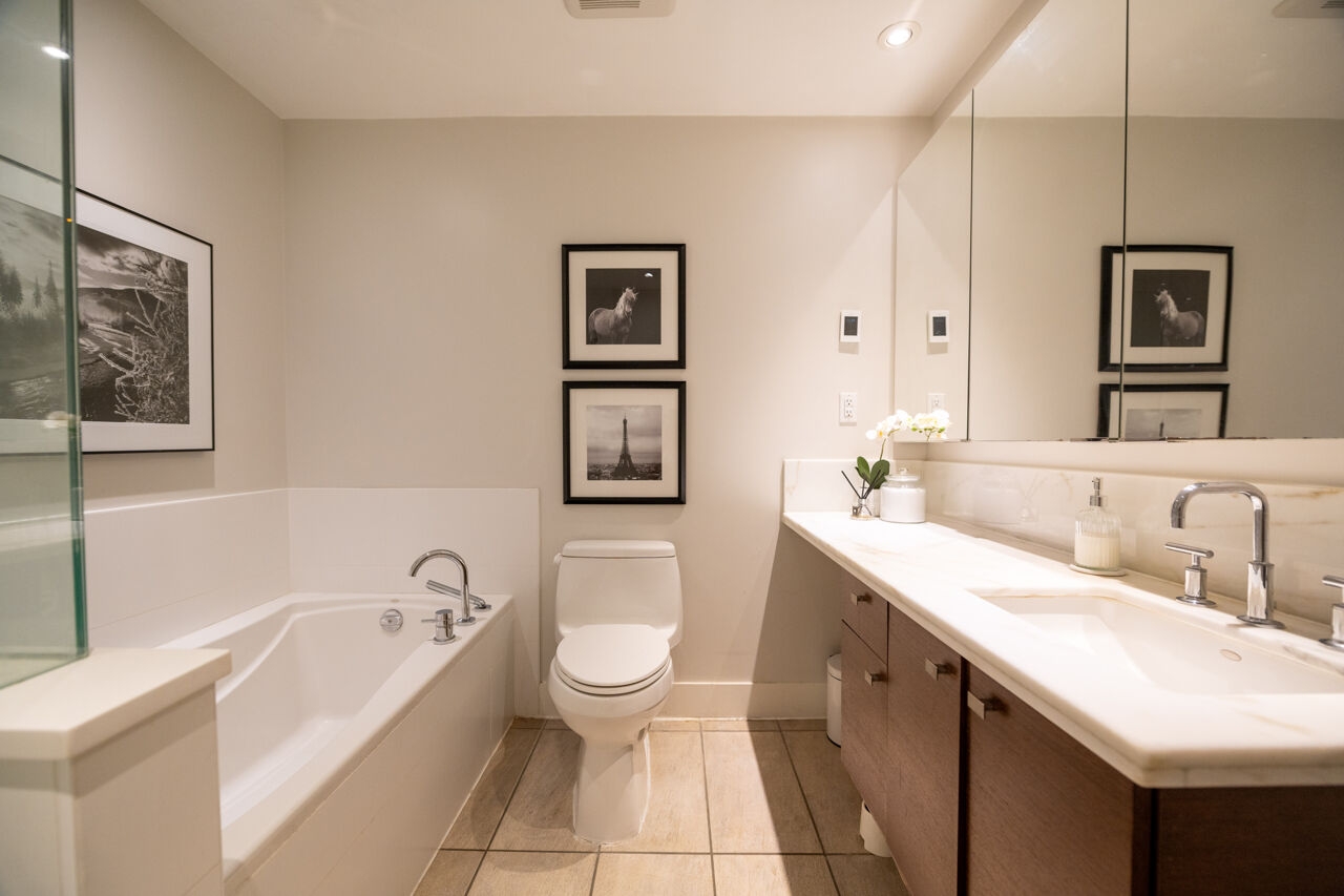 King-size primary bedroom with seating area, walk-in closet and luxurious ensuite bathroom with glassed-in shower, soaker tub and large vanity